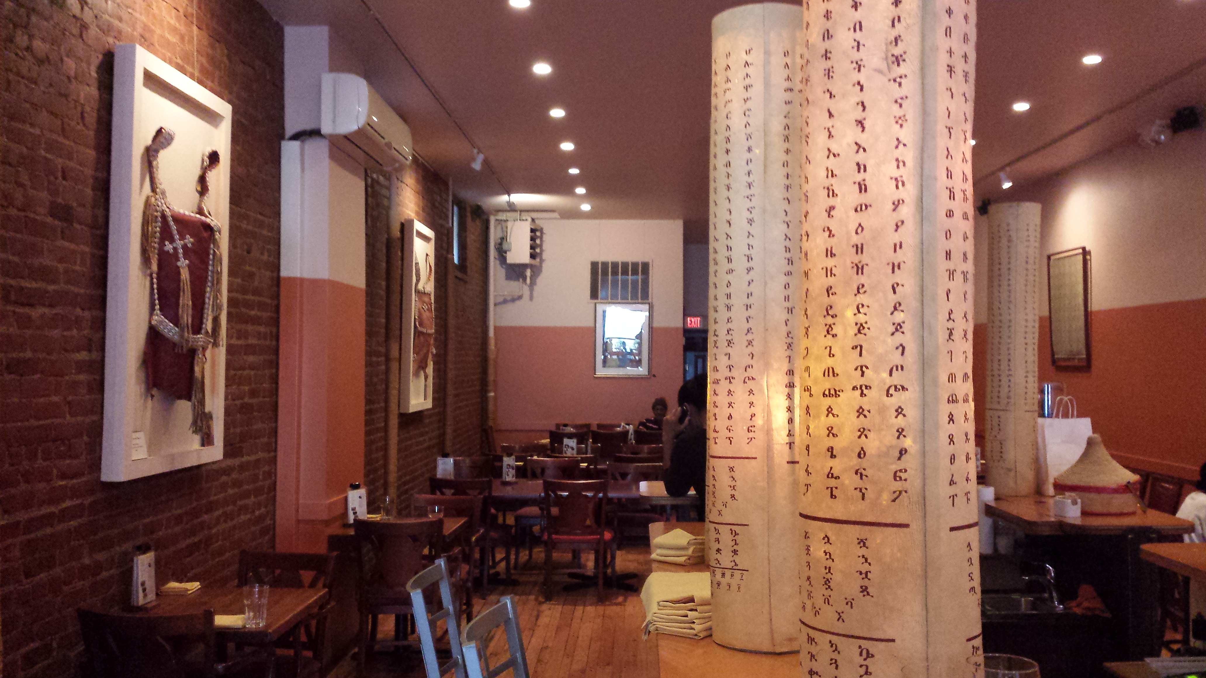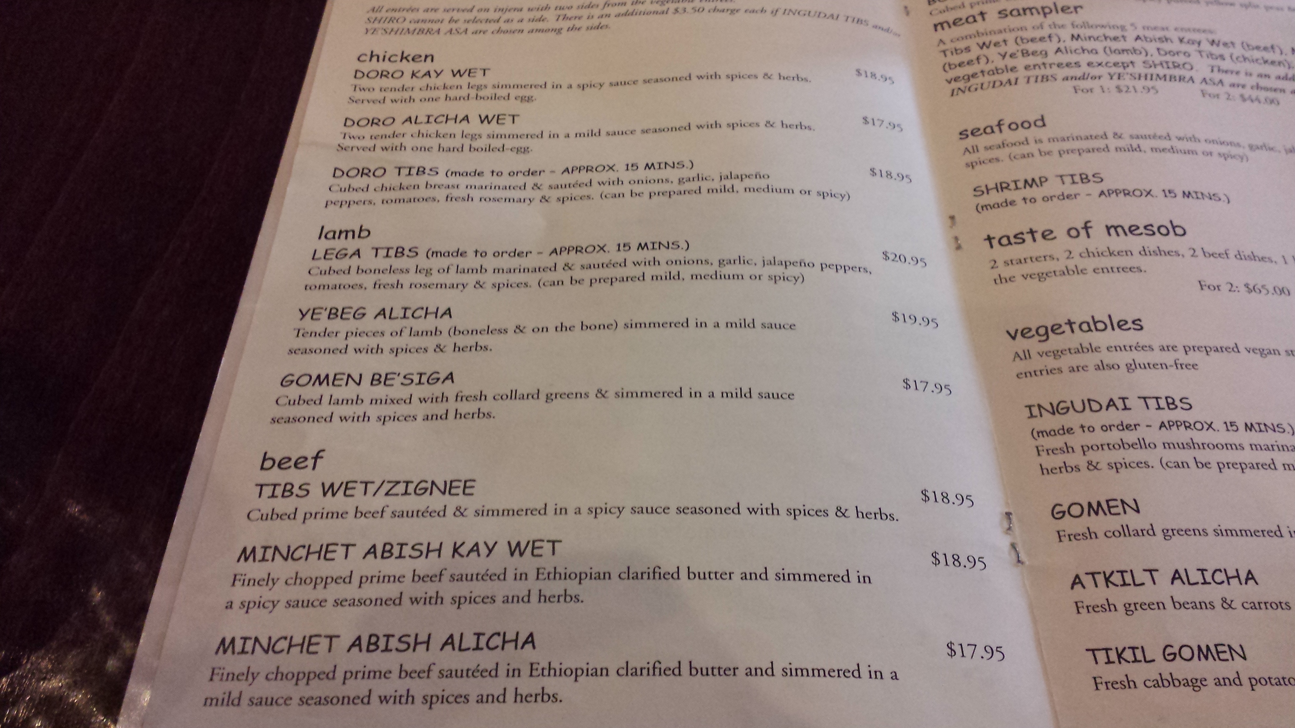 İçeri girdiğinizde sizi çok güzel ve yoğun bir baharat kokusu karşılıyor. Dükkan sahipleri Etiyopyalı ve çok iyi insanlar. Bize menüdeki yemekleri teker teker açıkladılar sağolsunlar. Biz meat sampler denemek istedik yanii bir çok etin bir arada bulunduğu hepsinden tadımlık bir sipariş verdik.